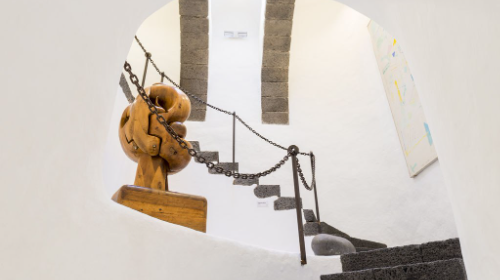 -La escalera tubular blanca: Es una de las piezas más fotografiadas del castillo. Fue diseñada por Manrique como un símbolo de la conexión entre el pasado y el futuro.