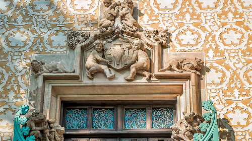 -Elementos góticos: Las esculturas y ornamentaciones en la fachada representan la industria, el arte y el coleccionismo.