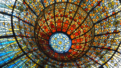 -Arquitectura metálica y vidrio: El edificio se articula sobre una estructura metálica recubierta de vidrio, que al incidir el sol, transforma el Palau en una caja de luz y color.