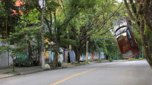 Cuando llueve en São Paulo, es habitual que troncos y ramas caigan sobre la calzada, provocando quejas de los conductores. Convencidos de que la ciudad les pertenece, culpan a los árboles de perturbar el tráfico. A partir de estos episodios e inspirado por las palabras de uno de los padres de la revolución científica, Francis Bacon, Lucas Bambozzi se pregunta qué pasaría si los árboles se vengaran de los coches con “una especie de justicia salvaje”. Imagina que, hartos de vivir en el asfalto y estresados por la contaminación, atraparían vehículos para retenerlos como rehenes. Estas visiones se hacen realidad cuando un Volkswagen escarabajo blanco aparece colgado de un eucalipto en las tierras de una hacienda cerca de São Paulo que habían sido arrasadas por el fuego. La pieza site-specific se incorpora al recorrido al aire libre de la finca hasta que un nuevo incendio provoca la caída del auto.