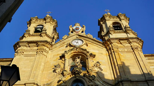La iglesia se apoya en el monte Urgull, pero es del otro lado de la bahía, del monte Igeldo, de donde procede la mayor parte de la piedra utilizada para su construcción. Si nos colocamos de espaldas a su puerta principal y miramos de frente nuestros ojos se toparán, allí al fondo, con la Catedral del Buen Pastor. Desde esta misma posición, a mano izquierda la calle 31 agosto, la única que sobrevivió al incendio de la ciudad durante el asalto de las murallas por las tropas inglesas en 1813 y a su derecha está el puerto de la ciudad.